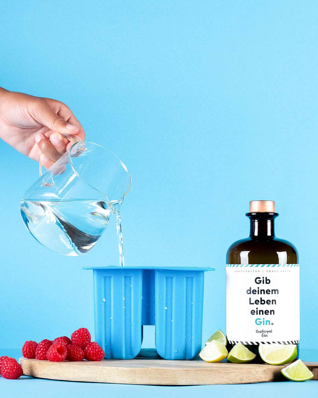 Fülle die Eisformen bis zur Hälfte mit der Gin Tonic Mischung auf.