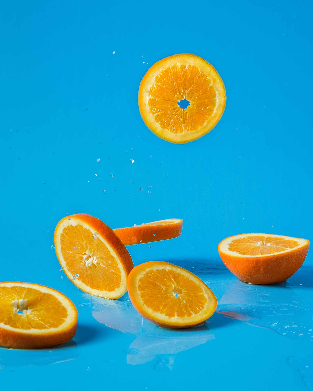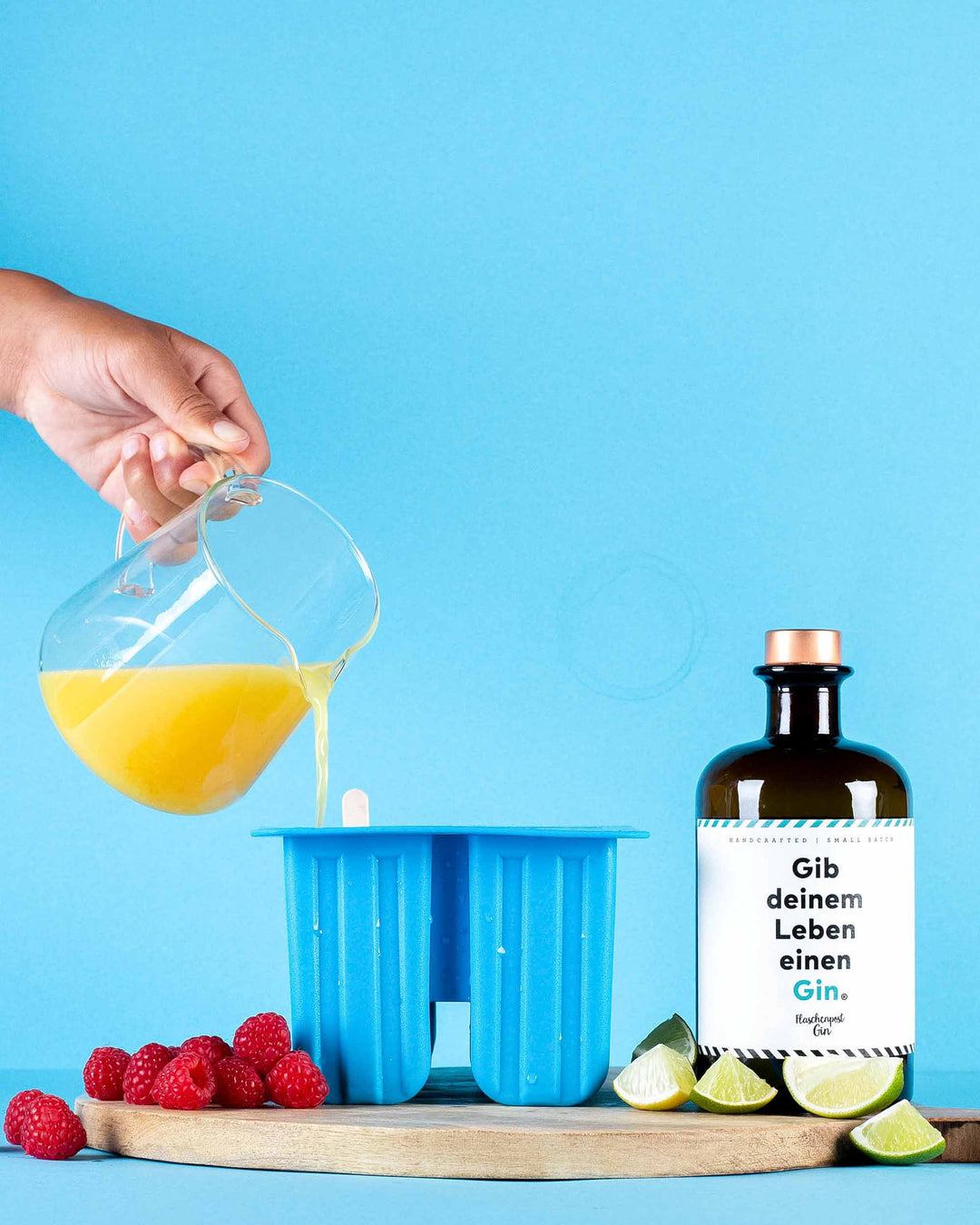 Nun bereitest du dieselbe Gin Tonic Mischung noch einmal zu, lässt sie abkühlen und mischst sie anschließend mit 10 cl Orangensaft. Fülle die Formen bis oben hin mit der Mischung auf und stelle sie für mindestens 6 Stunden, besser über Nacht, ins Gefrierfach.