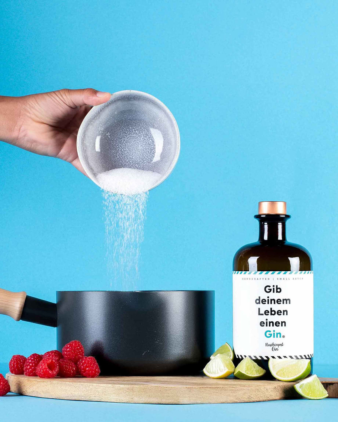 Nimm den Topf vom Herd und lasse die Mischung etwas abkühlen. Anschließend gibst du Gin und Tonic hinzu und stellst den Topf beiseite.