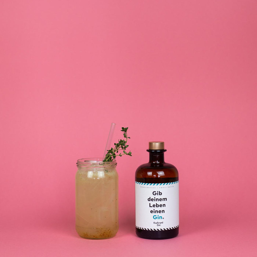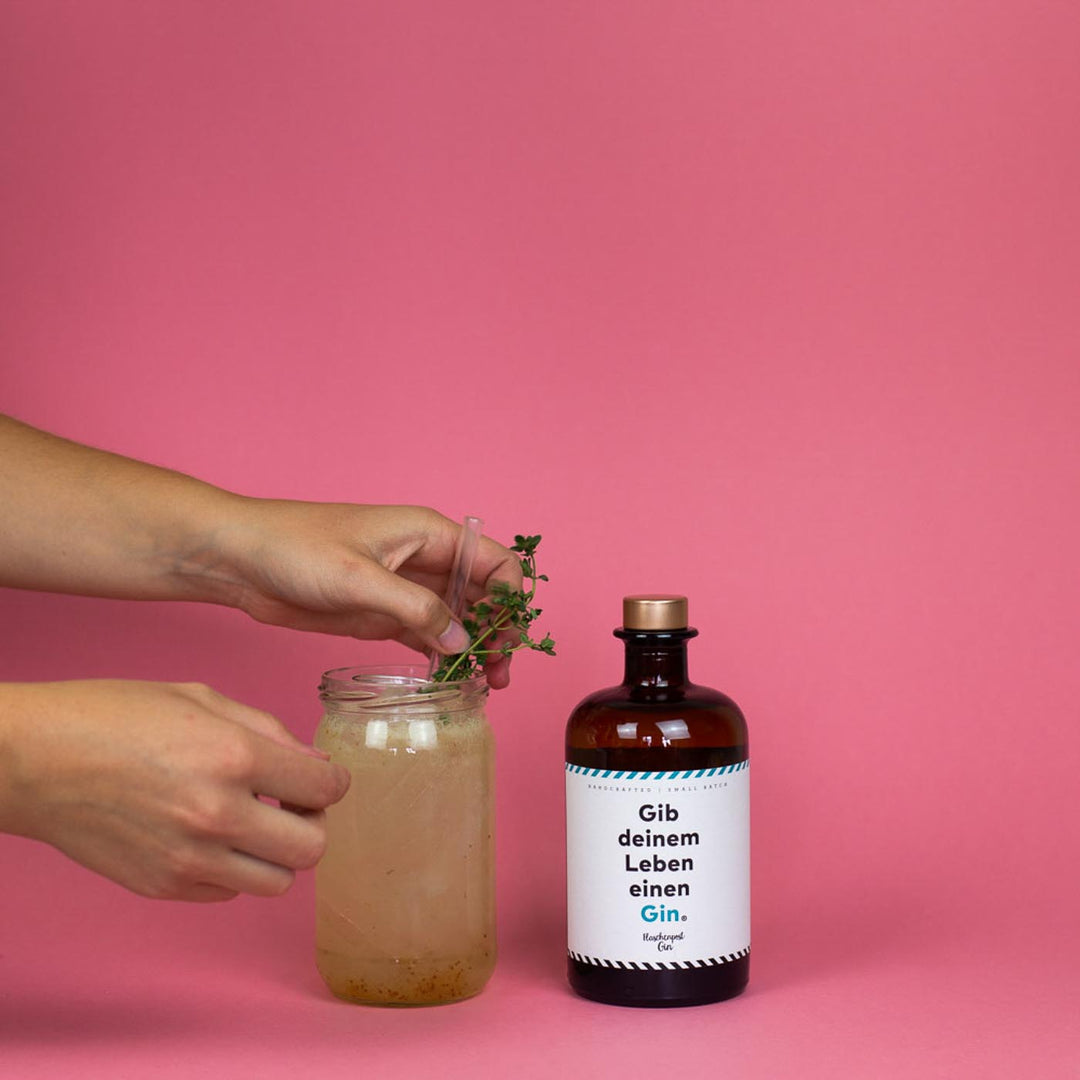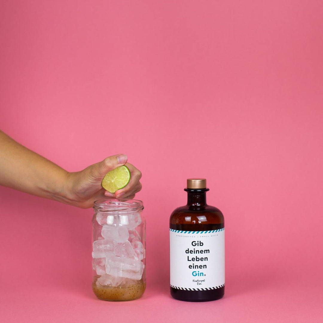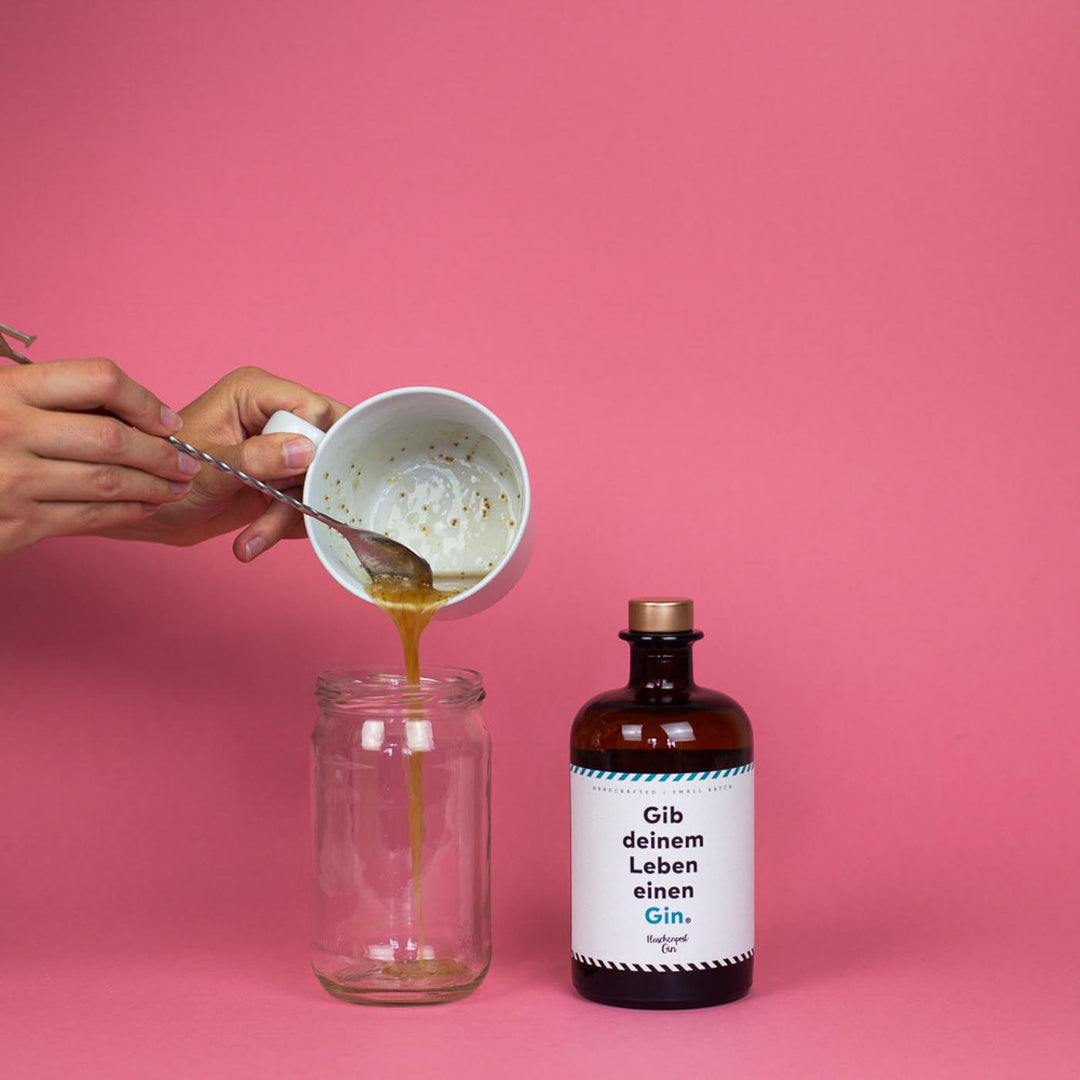 Anschließend gießt du 5 cl des Flaschenpost Gins darüber und verrührst alles mit einem Löffel.