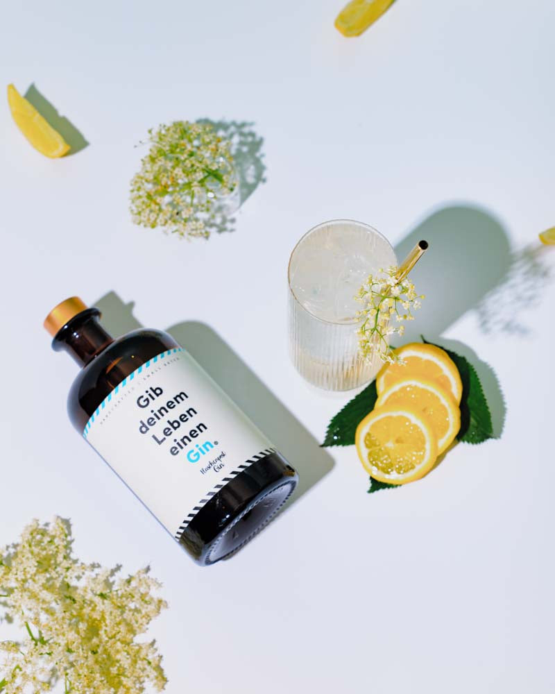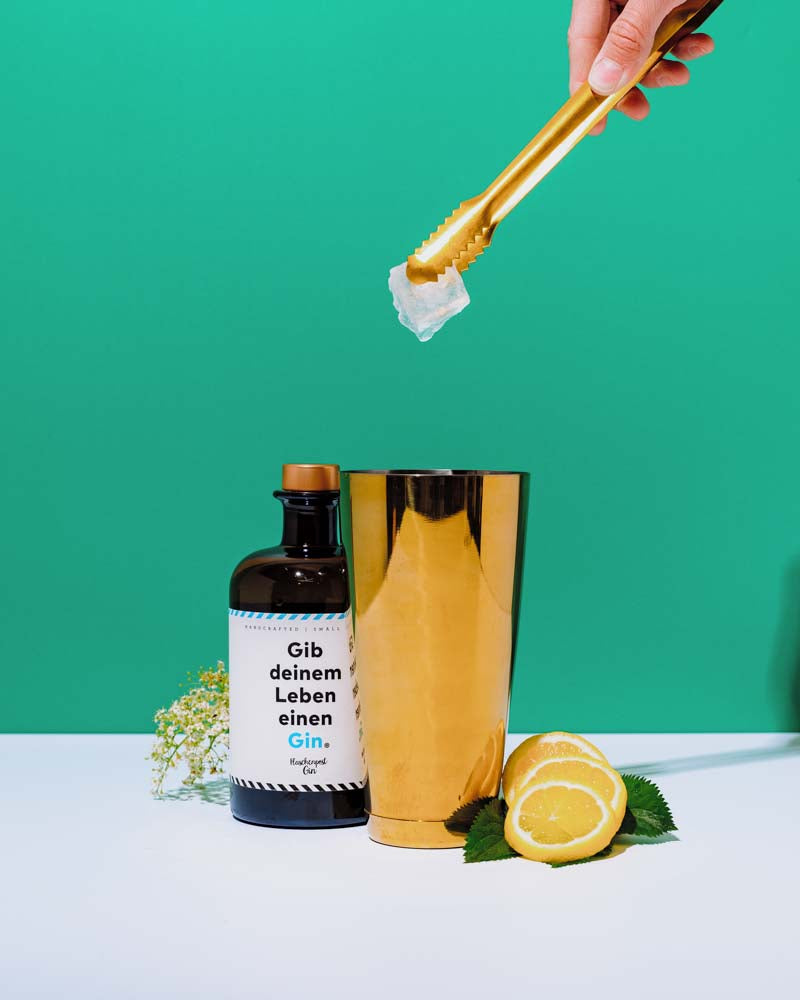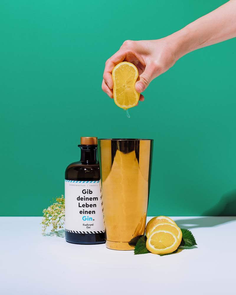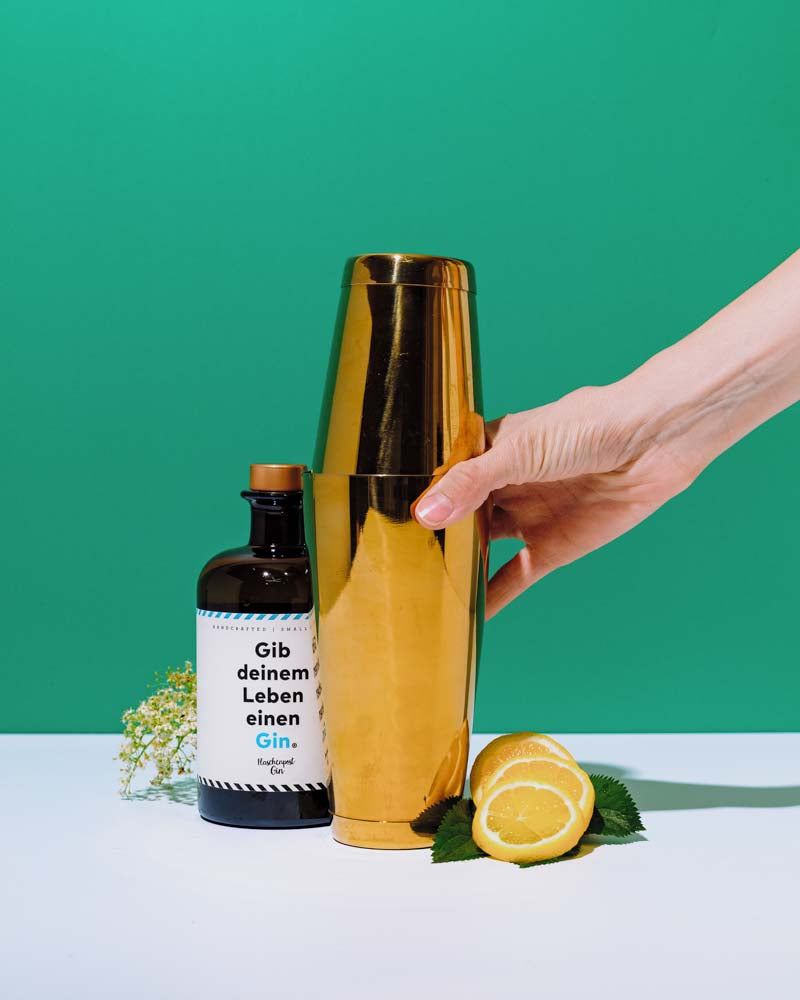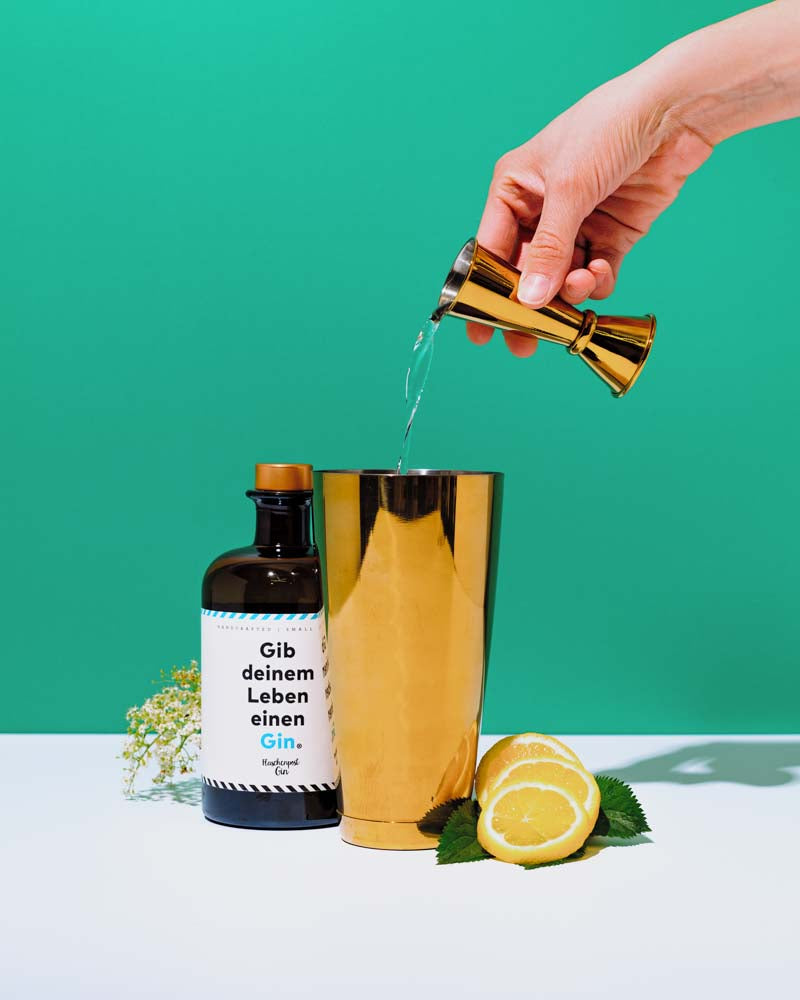 Zuerst gibst du Gib deinem Leben einen Gin, frisch gepressten Zitronensaft und Holunderblütensirup in deinen Shaker!