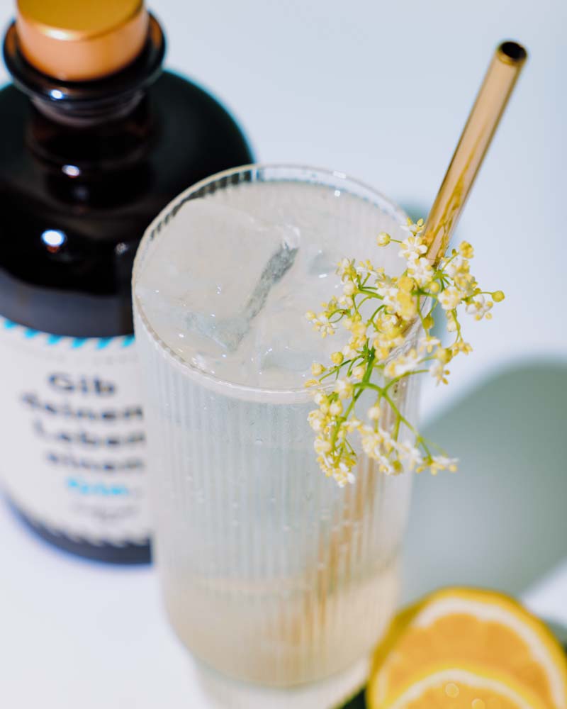 Im letzten Schritt kannst du deinen Drink mit weißen Blüten oder Zitrone garnieren.
