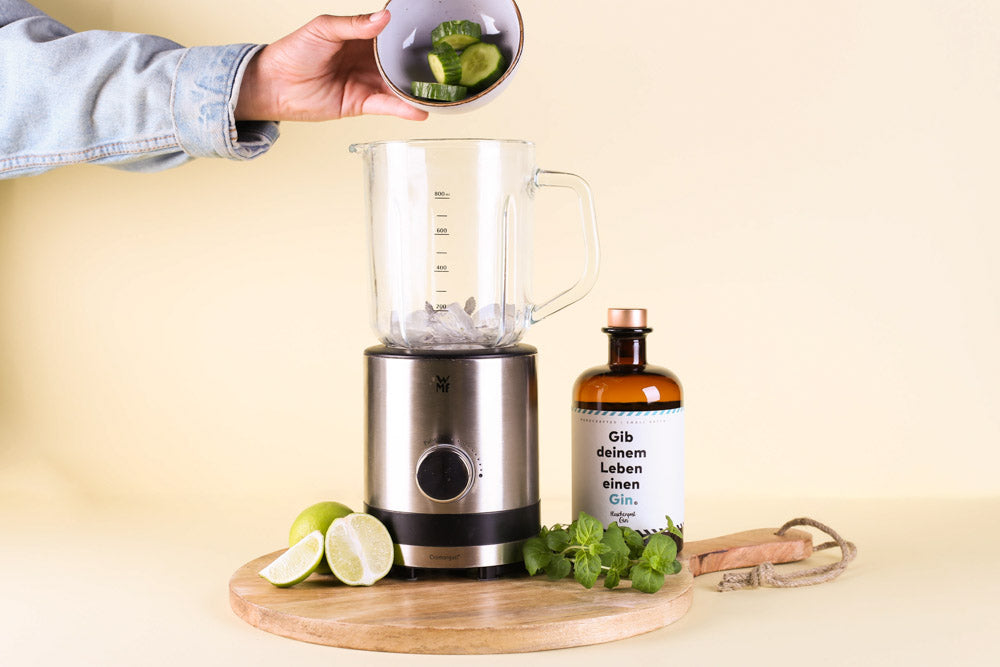Gib 4 cl Flaschenpost Gin, 0,5 cl frisch gepressten Limettensaft, Gurkenscheiben, Minze und 4 Eiswürfel in den Mixer.