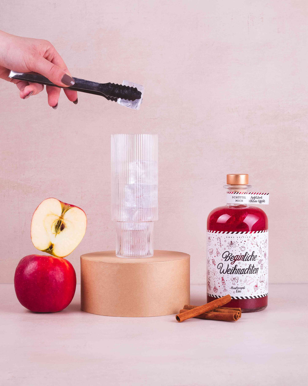 Zuerst füllst du dein Glas bis zum Rand mit Eiswürfeln. Danach gibst du 5 cl der Flaschenpost Gin BeGinliche Weihnachten Edition hinzu.