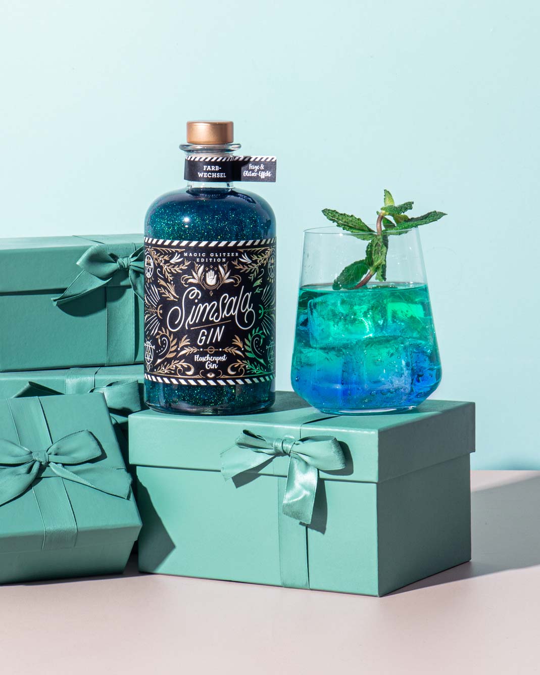 Unsere Magic Glitzer Edition ist der erste Gin mit Farbwechsel und Glitzer. Er überzeugt mit dem Special Botanical Feige und hat noch dazu einen magisch glitzerndem Farbwechsel von blau zu grün – mit dem Simsala Gin mit Glitzer steht dir ein magischer Abend bevor!