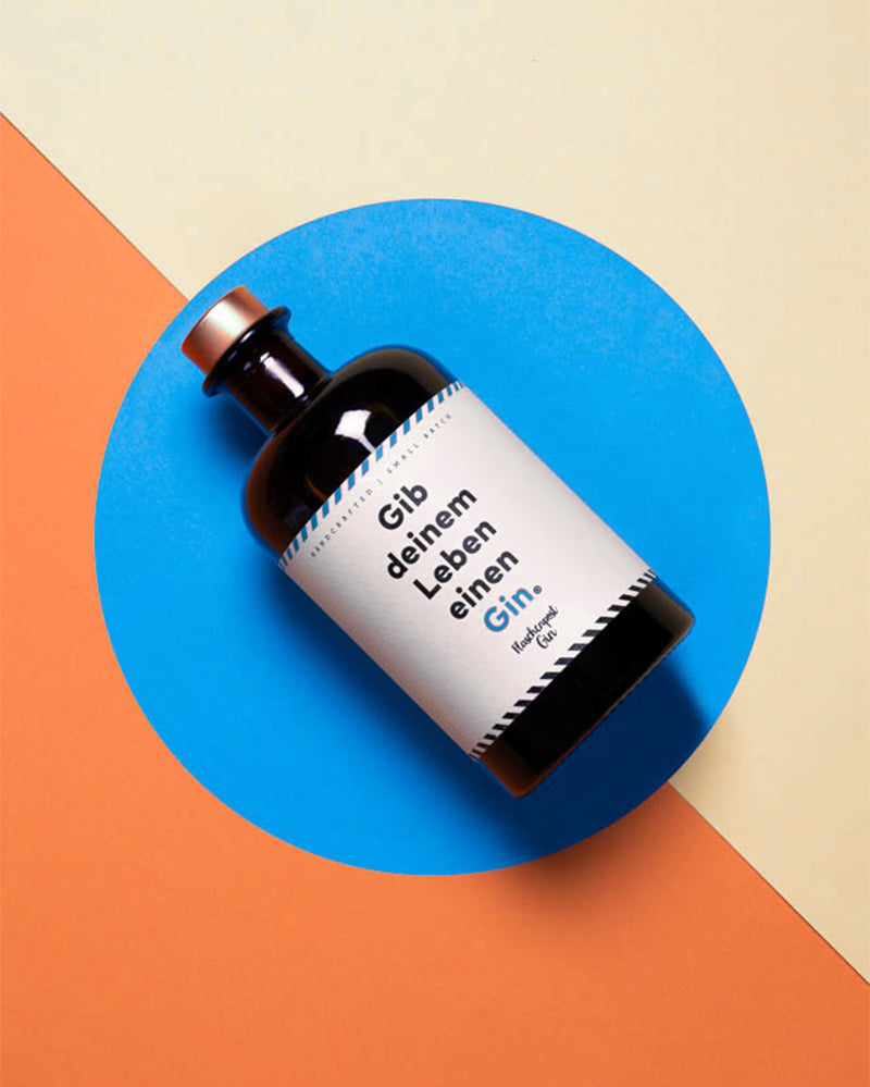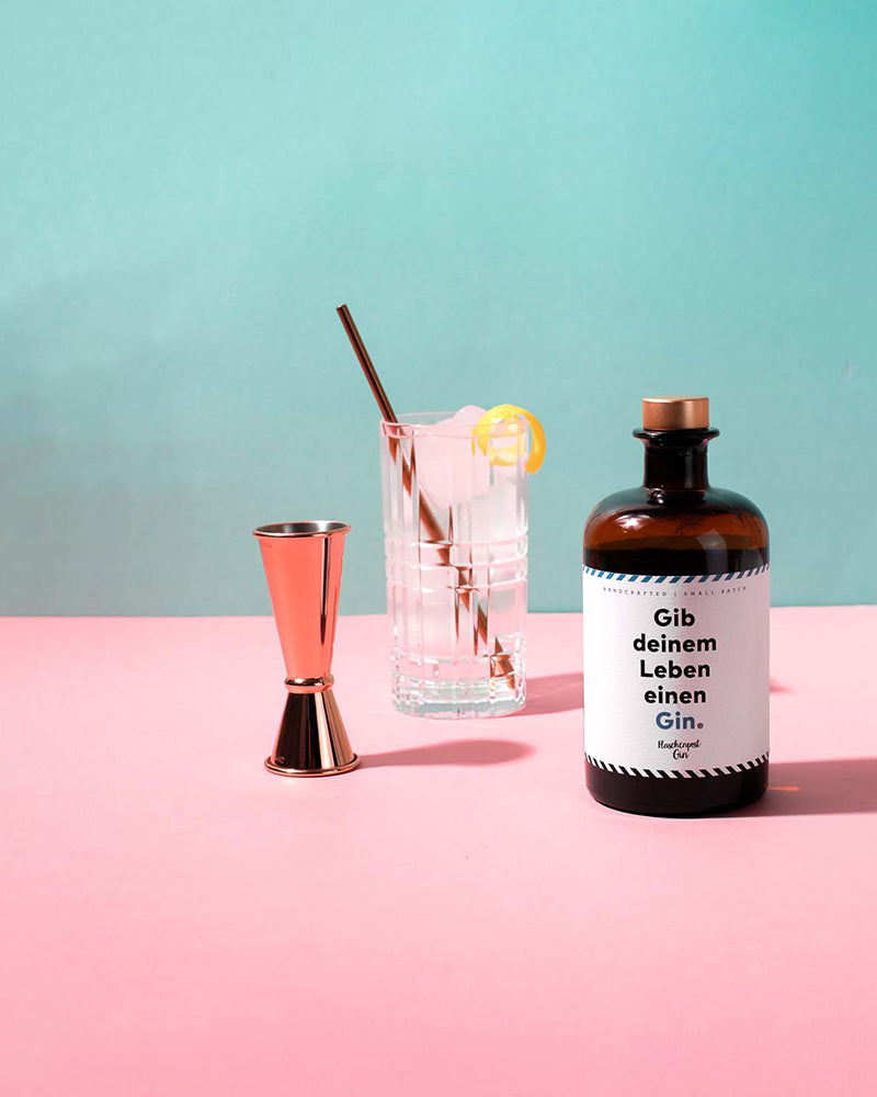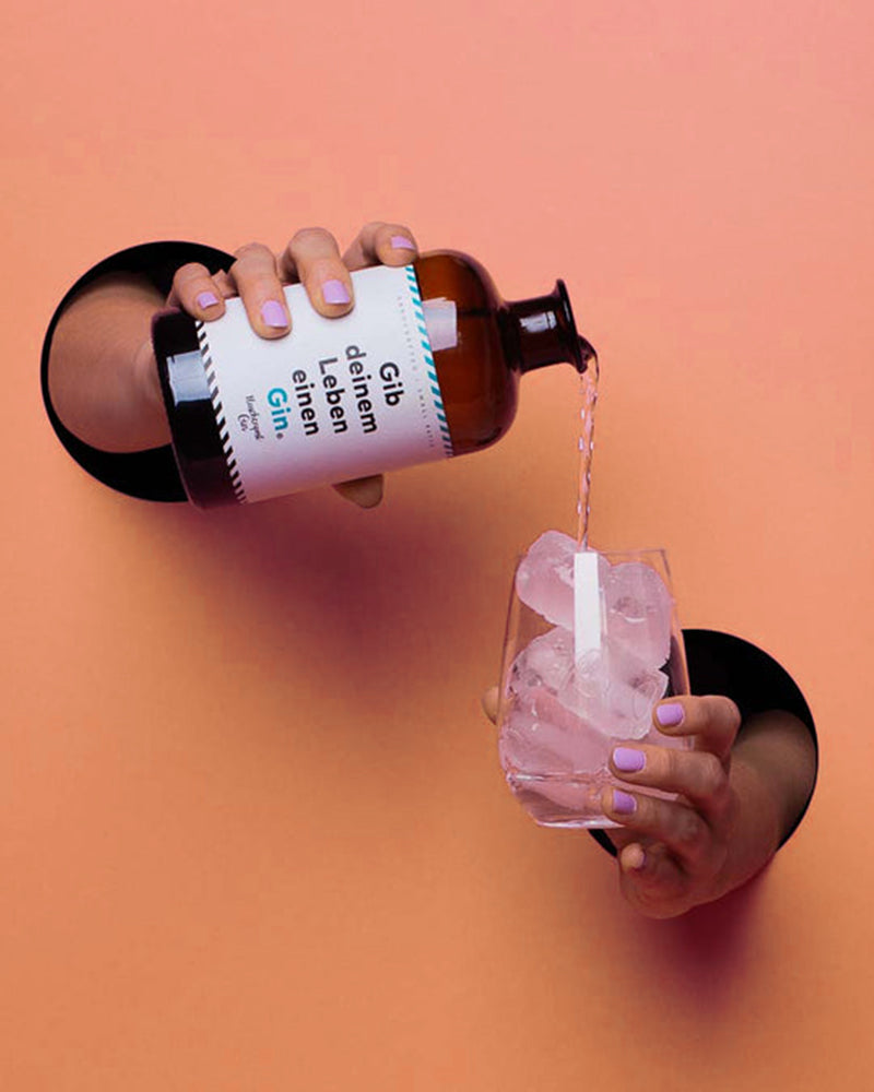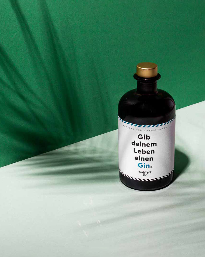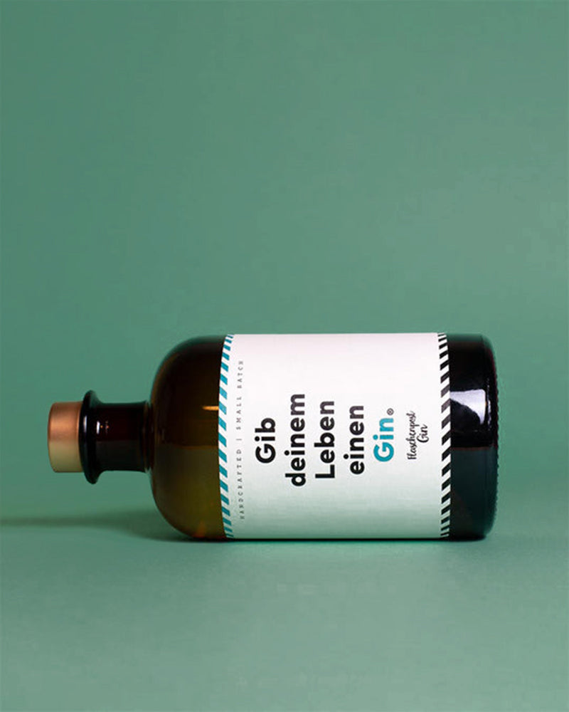 Das Design unseres Klassikers "Gib deinem Leben Gin" ist minimalistisch. Auf dem weißem Etikett steht in schwarzer moderner Schrift: "Gib deinem Leben einen Gin". Das Wort Gin wird in einem türkis hervorgehoben.