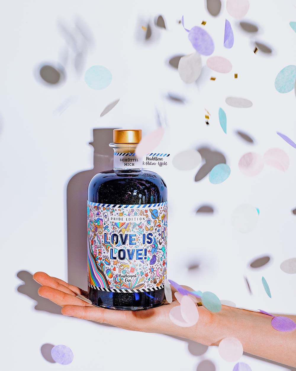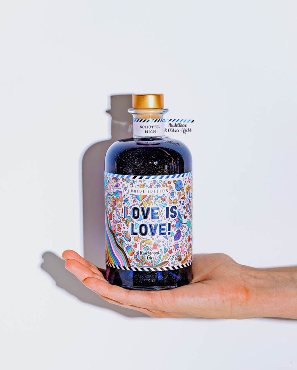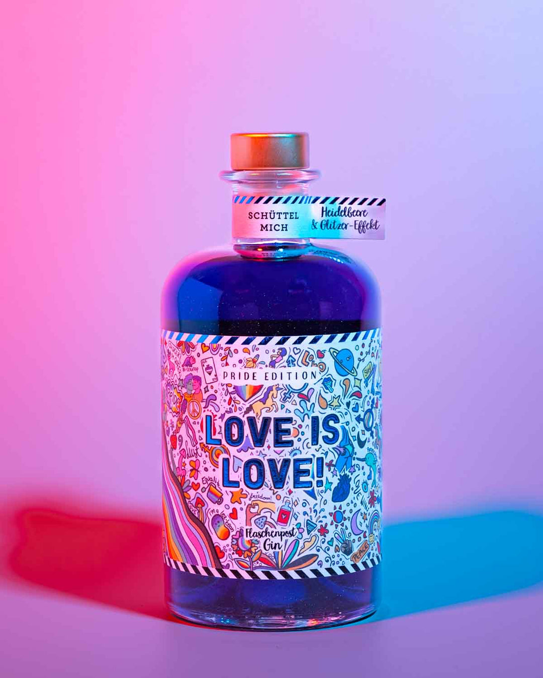Unsere Pride Edition - der blaue glitzernde Gin mit dem bunten Etikett und dem Statement: Love is Love! Das Etikett ist bunt und enthält viele kleine regenbogenefarbene Details. Dieser Gin schmeckt fruchtig nach Heidelbeere  und ist durch seinen Glitzer-Effekt ein wahrer Hingucker.