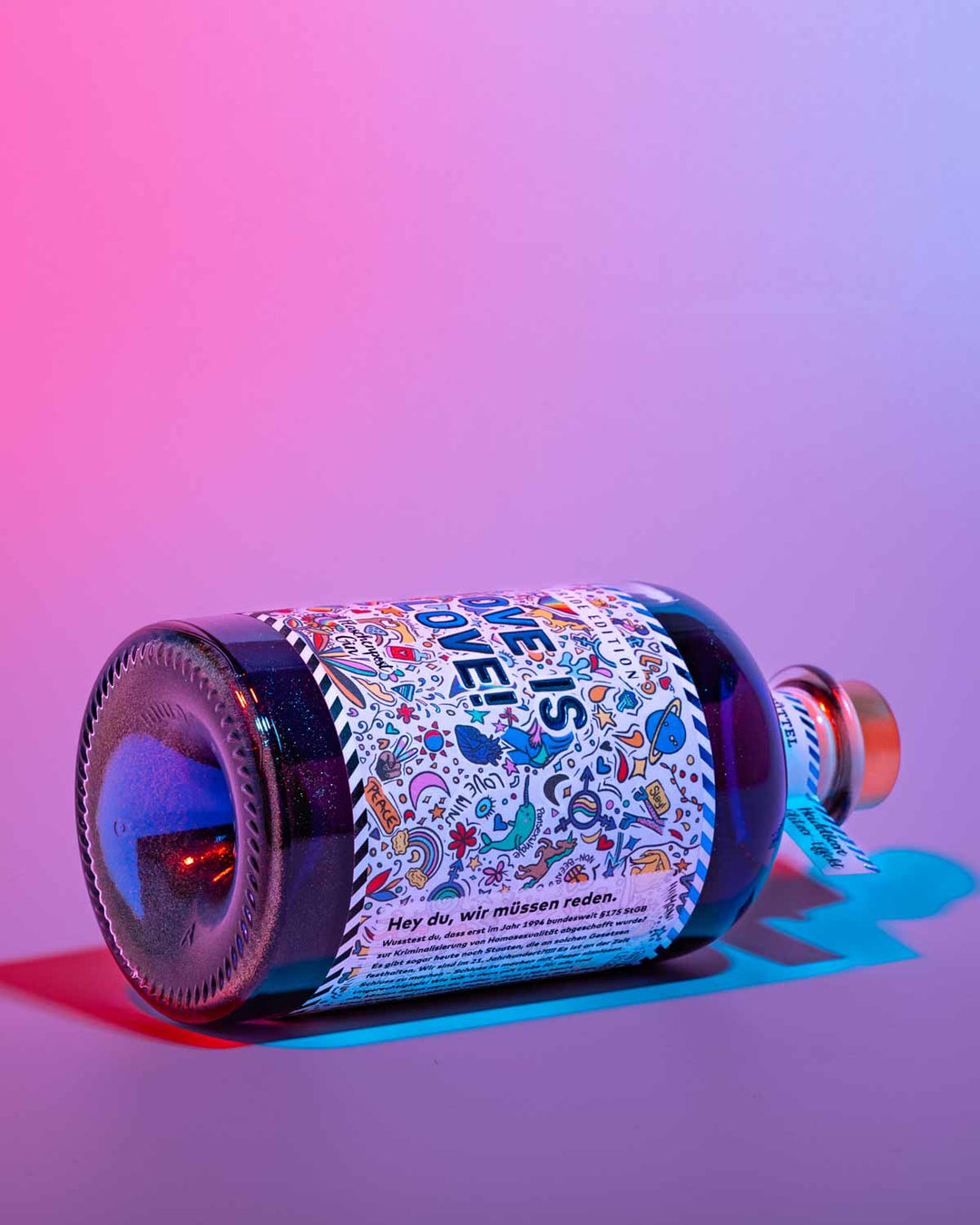 Unser Statement Gin mit dem Spruch: "Love is Love", seine blaue Farbe und der faszinierende Glitzer-Effekt machen ihn zur idealen Zutat für deinen nächsten Gin & Tonic.